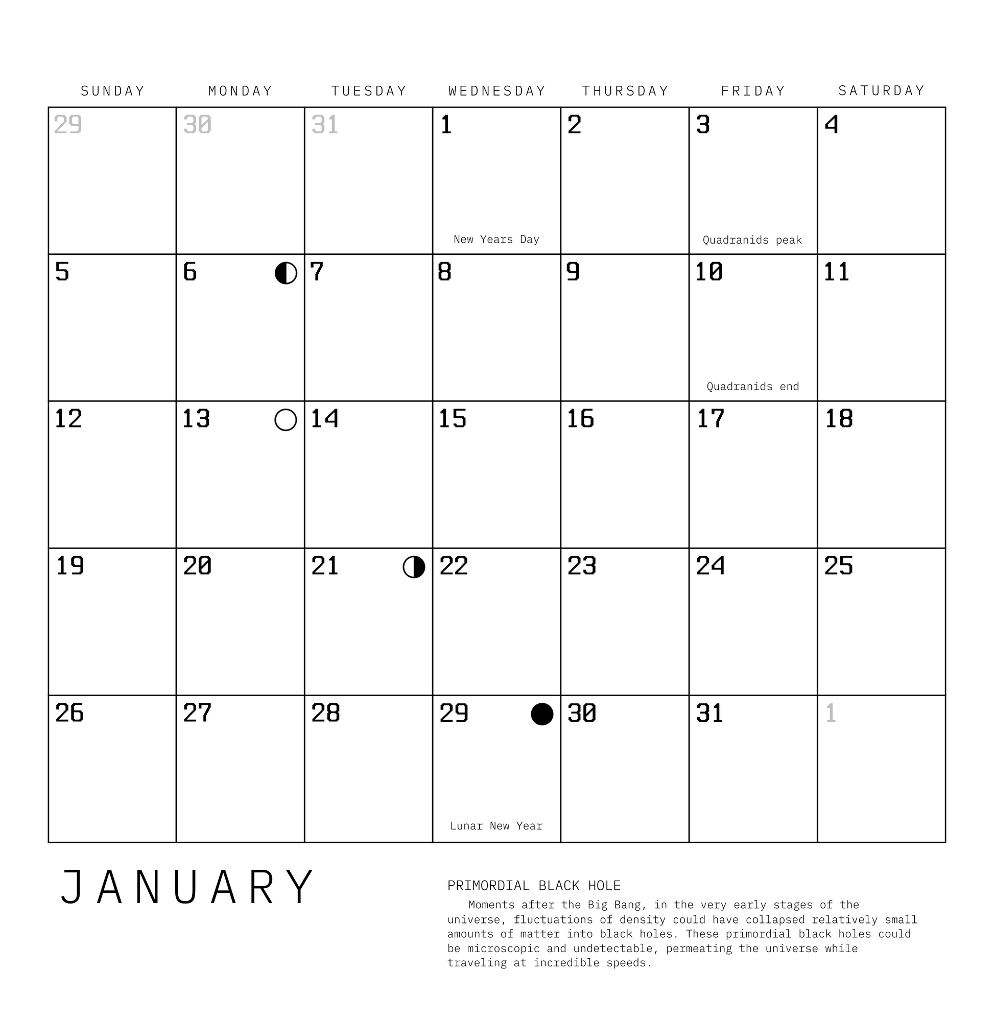 an illustrated calendar of sudden and unpreventable world ending astronomical events